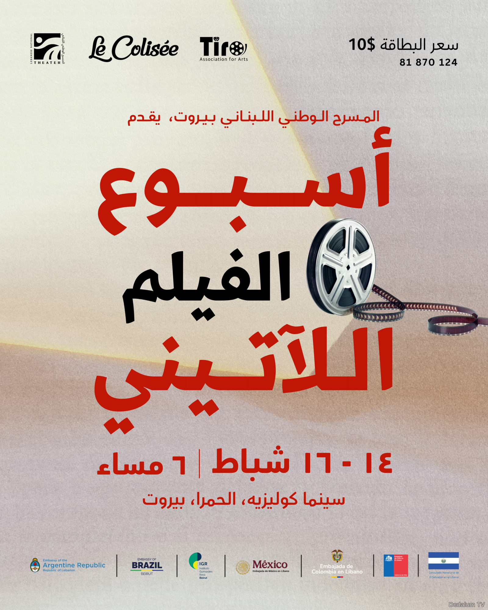بيروت - لبنان أعلنت "جمعية تيرو للفنون" و"مسرح إسطنبولي" عن إطلاق أسبوع السينما اللاتينية في المسرح الوطني اللبناني بيروت، في سينما الكوليزيه التاريخية في الحمرا في الفترة الممتدة من 14 ولغاية 16 فبراير/شباط ، بمشاركة أفلام روائية ووثائقية وتحريك قصيرة وطويلة من البرازيل والمكسيك والأرجنتين وتشيلي وكولومبيا والسلفادور .